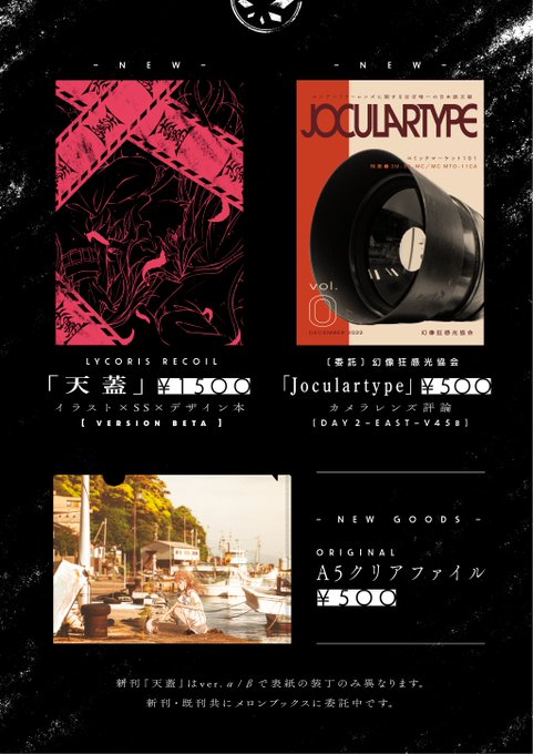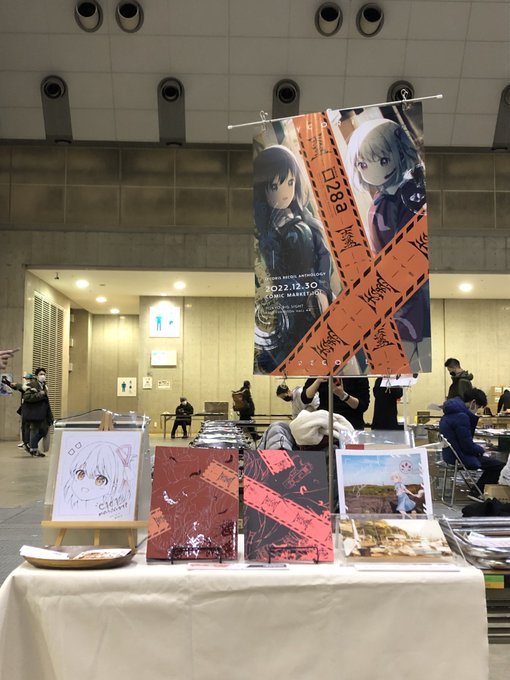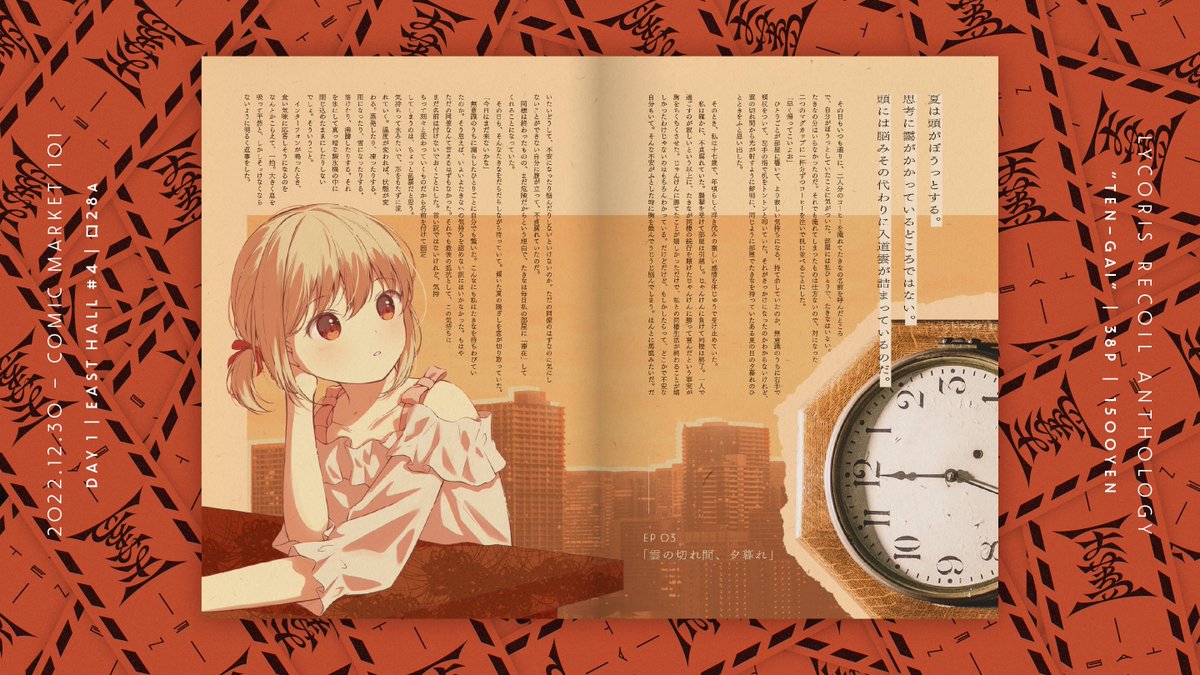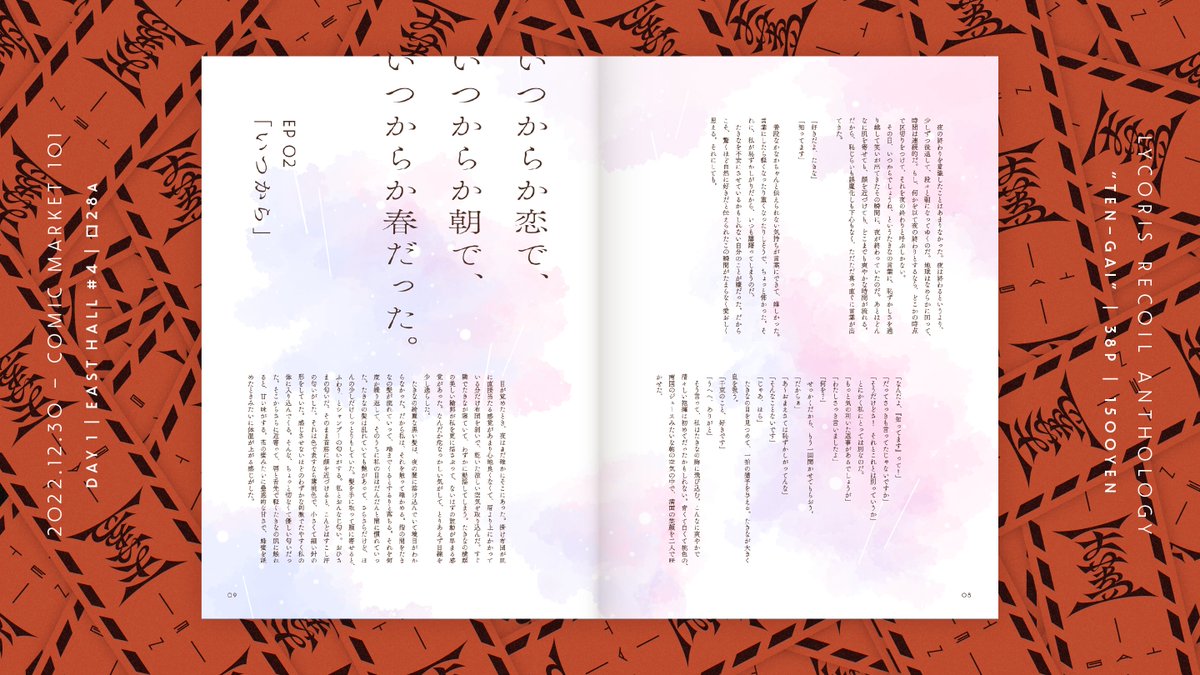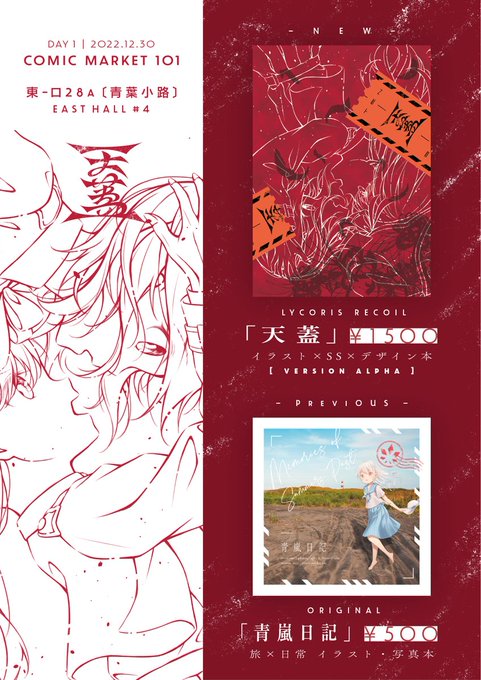 ■ #C101 告知 ■ 冬コミでは真鯛(@Eris_and_Sara )先生と合同でリコリコイラスト×SS×デザイン本『天蓋』を頒布します! 千束とたきなを描いたイラストや短編・超短編に加え、特殊印刷をはじめとした紙の本ならではの仕掛けを38Pに詰め込みました! #リコリコ ▶︎ 通販:melonbooks.co.jp/detail/detail.…