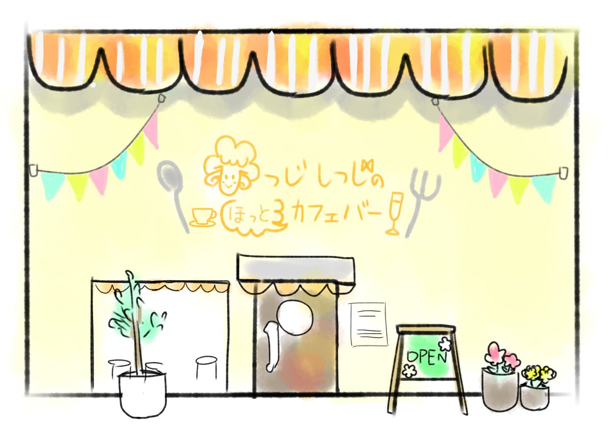 今日からひつじしつじのほっとカフェはカフェバーになります✨ 夜はお酒も提供します。 ビール飲んで嫌なこと忘れちゃおう! そして、カフェバーで僕の妹のハナが働いてくれることになりました✨ カフェバーとハナをよろしくお願いします✨ #春の創作クラスタフォロー祭り #絵描きさんと繋がりたい