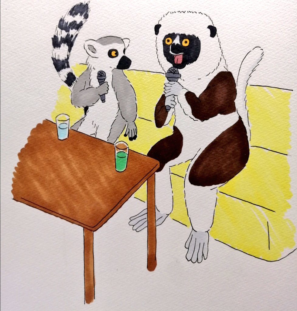 『急にハモられたワオキツネザル』 #ワオキツネザル #コクレルシファカ #アナログ絵 #アナログイラスト #私の絵柄が好きな人にフォローされたい