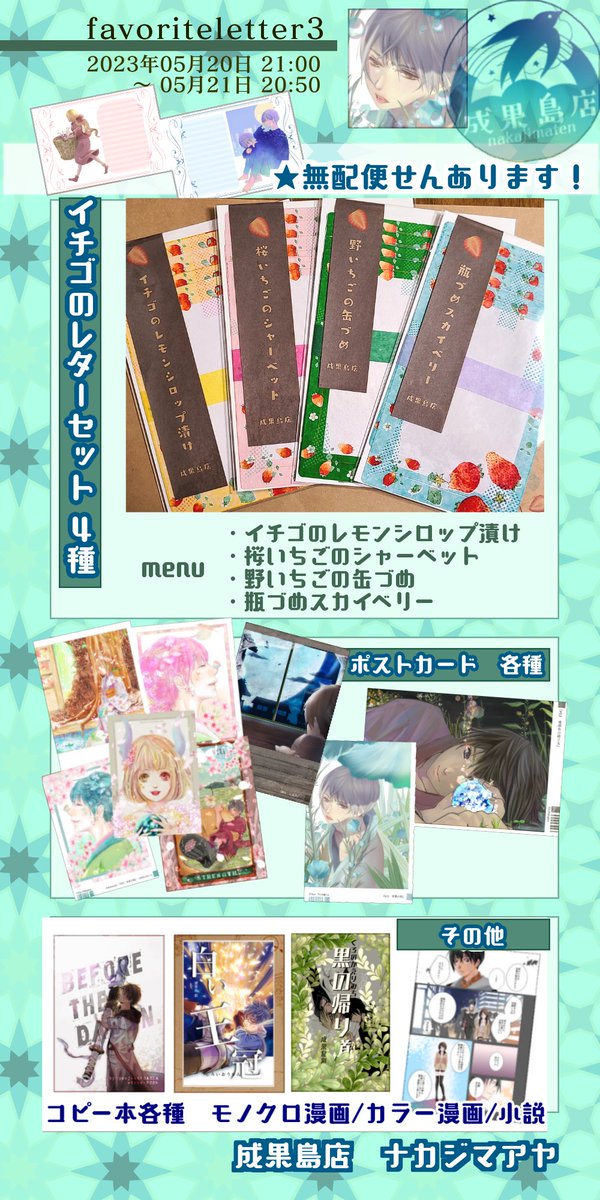 #ふぁぼれた3お品書き 今週末はオンラインイベント『favorite letter 3』に参加します! ★無配便せんあります 一枚目、お品書き 二枚目、サークルカット 三枚目、ブース外観 四枚目、無料配布の便せん よろしくお願いします!