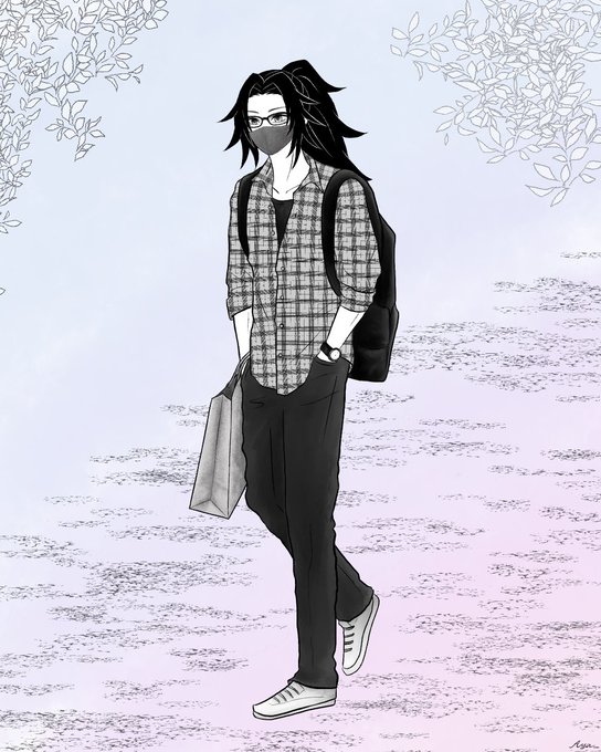 9 51 兄上に👓と😷、背景に🌿を加えました☺️ ラフ画の紙袋の向きが何か不自然で、🛍を腕にかけてポケットに手を入れて自撮りして描きました😂 22/02/23 08:29