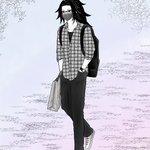 兄上に👓と😷、背景に🌿を加えました☺️ ラフ画の紙袋の向きが何か不自然で、🛍を腕にかけてポケットに手を入れて自撮りして描きました😂