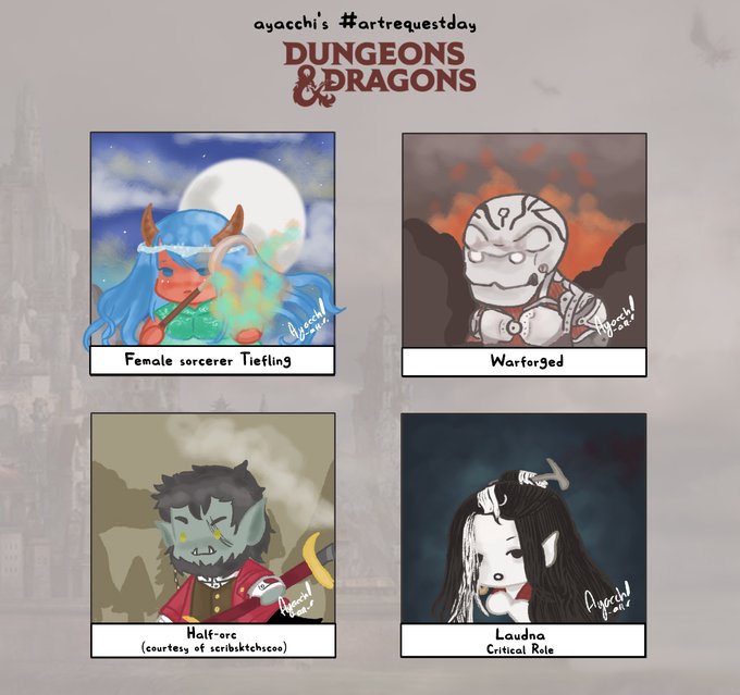 First #artrequestday is done! I hope I did the characters justice. 🥺🥺 Requesters: - Tiefling: octodaisy (reddit) - Warforged: Aperture_T (reddit) - Half-orc: @scribsktchscoo - Laudna: @Eljay_EarthGirl #dungeonsanddragons #dndart #dnd #DnDcharacter #criticalrole