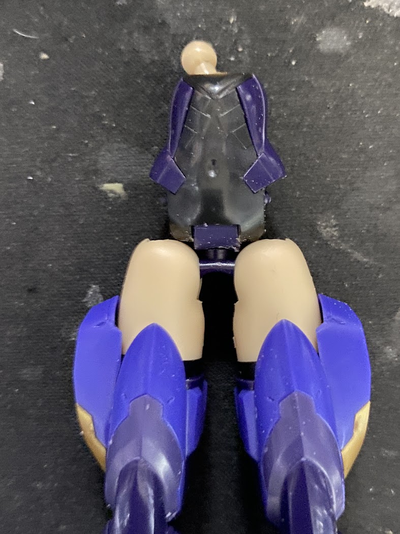 #メガミデバイス 朱羅。太ももが干渉して押し込みきれないので腹部側の下、カバーで見えなくなる部分を削り込む。