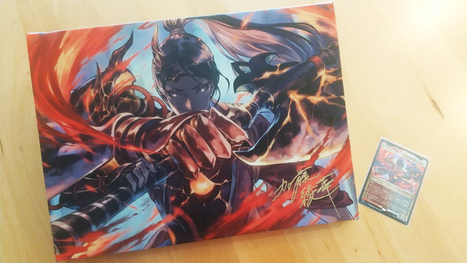 マジック:ザ・ギャザリング「神河:輝ける世界」にて『漆月魁渡』の販促イラストを描かせていただきました!プレリリース・キットに同封された紙面にてご使用いただいております。 魁渡さんの左肩にはさり気なくポンポンちゃんも乗っております🍃 mtg-jp.com/neo/ #MTGNeon #mtgjp