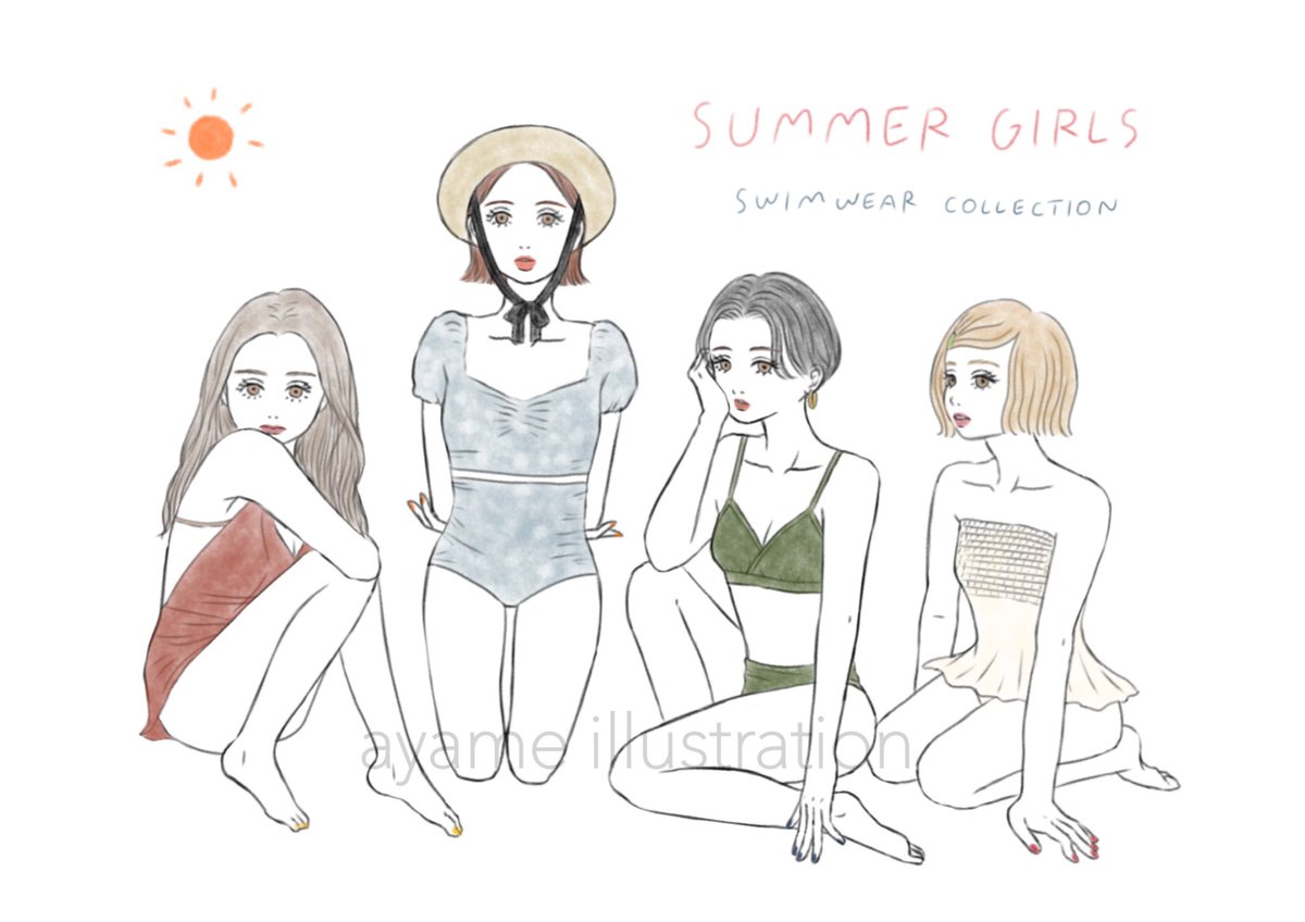 ~SUMMER GIRLS~ 女の子を魅力的に描くのが好きだと改めて実感しながら描きました🏖 今年も可愛い水着が沢山あり、どれを描こうか選ぶ時から楽しかったです☺️ #女性イラスト #夏イラスト #illustration #イラスト #水着イラスト