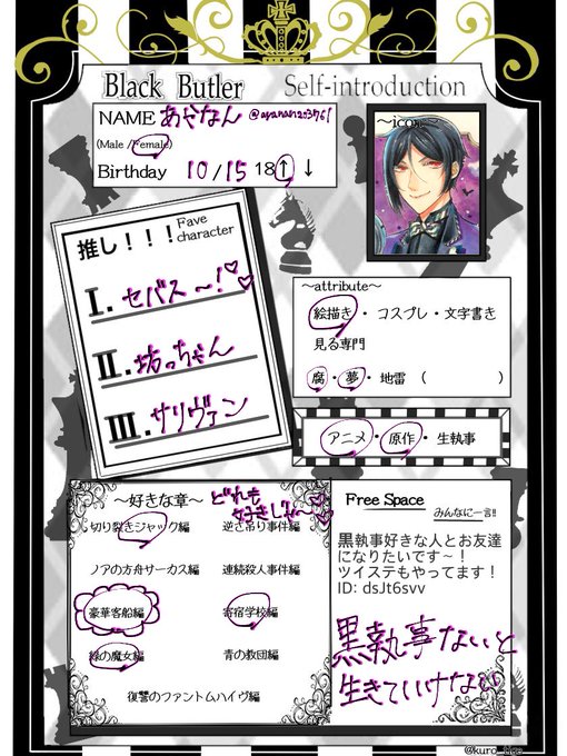 ちかちゃん(@kuro_tige )からテンプレお借りしました〜☺️💕 黒執事好きな人あまり周りにいないからお友達欲しいです😢 よろしくお願いします! #黒執事 #黒執事好きさんと繋がりたい #絵描きさんと繋がりたい