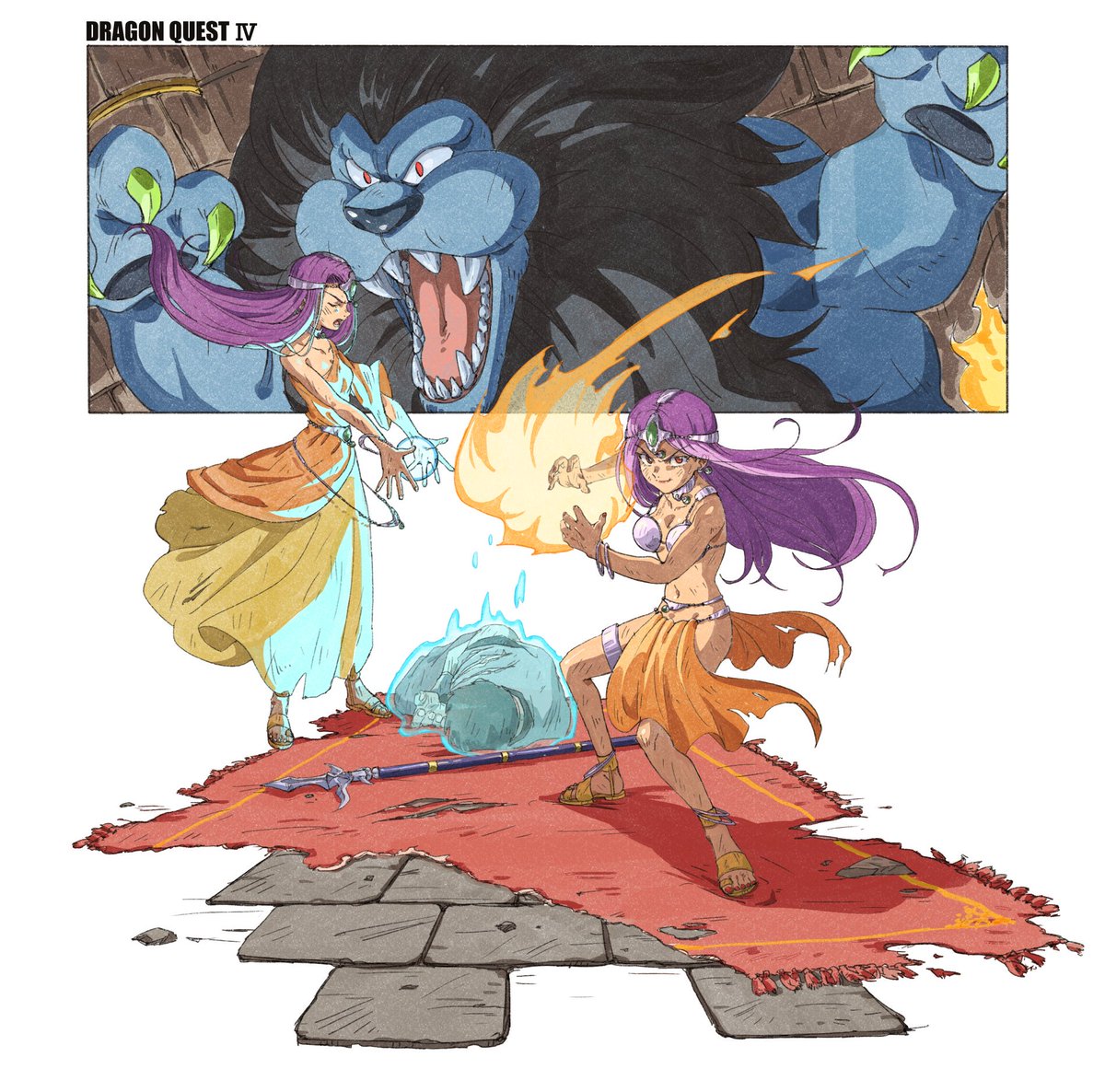 ドラクエ4より… マーニャ・ミネア・オーリンVSキングレオ 三人でキングレオに勝ってほしいなという思いで描きました。