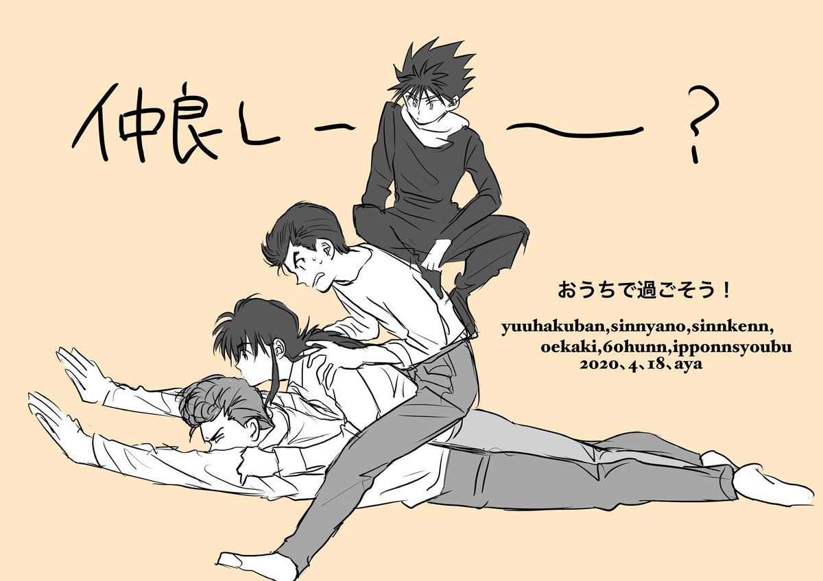 66 233 #幽白版深夜の真剣お絵描き60分一本勝負 お題「おうちで過ごそう」 幽白キャラ 桑原、蔵馬、幽助、飛影 20/04/18 22:34