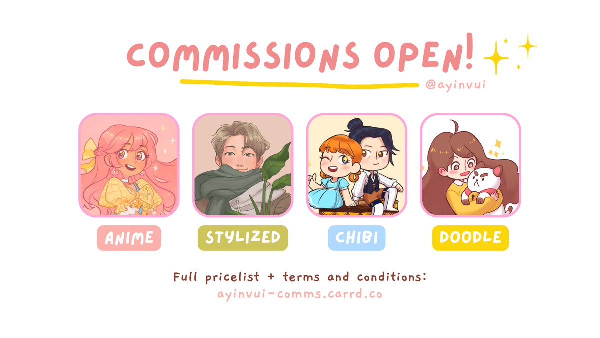 Hello my friends!🌸✨ Opening my art commissions for this year~! Will take on 3 slots at a time. 🌷 ayinvui-comms.carrd.co 🌷 (shares are much appreciated! ♡)