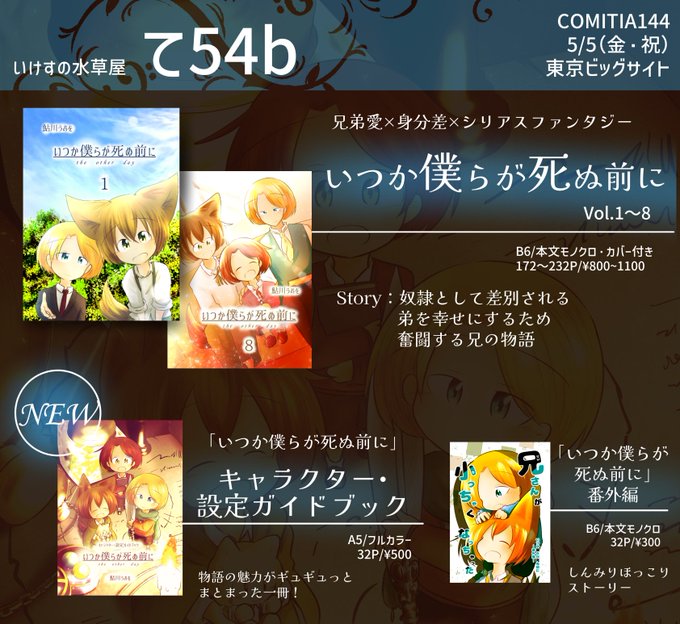 #コミティア144 にスペースいただきました! 5月5日(金・祝) 東京ビッグサイト 【て54b】いけすの水草屋 兄弟愛まんが1~8巻と新刊持ってきます!! 新刊は「いつか僕らが死ぬ前に」設定本になります! #COMITIA144