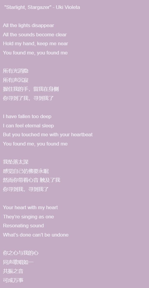 Itâs a dreamy melody that coloured the whole universe. Translate Uki sanâs new song to Chinese hopefully could help understanding in another language, å¬å°äºç¹å«çŸçæïŒè¯çç¿»æäžæïŒåçªð #VioletAtelier #UkiVioleta #starlightstargazer #mintotrans