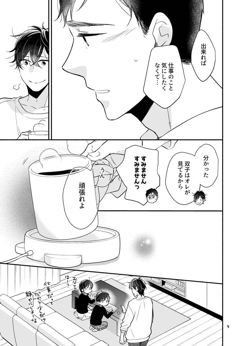 #J庭52 の新刊サンプルです。 本編後の二人と双子の日常の一コマを描いています。 (1/2)