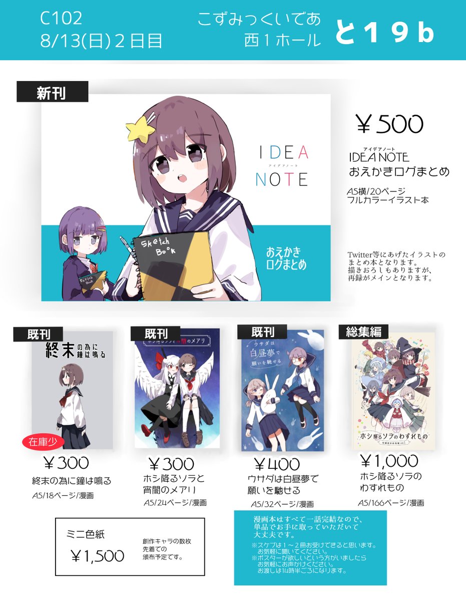 【C102】お品書き/サンプル 「IDEA NOTE おえかきログまとめ」A5横/20ページ/500円 過去にTwitter等にあげた創作イラストのまとめ本です。 イラストについて創作キャラたちが色々話してくれる形式です。 【Webカタログ】 webcatalog.circle.ms/Perma/Circle/1… 【BOOTH】 cosmicidea.booth.pm/items/4970430