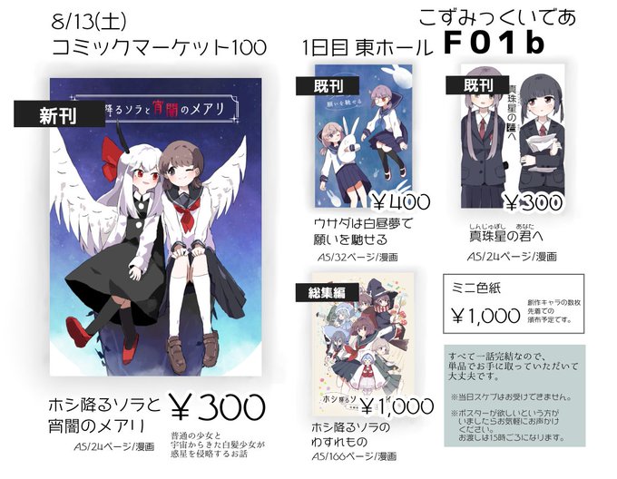 ■8/13(土) C100お品書き/サンプルの告知です。 「ホシ降るソラと宵闇のメアリ」 24P 創作漫画本 自暴自棄になった少女と宇宙からやってきた白髪少女のお話です。 長いサンプルはPixivでご確認ください。 ■Pixivサンプル pixiv.net/artworks/10012… ■Webカタログ webcatalog.circle.ms/Perma/Circle/1…