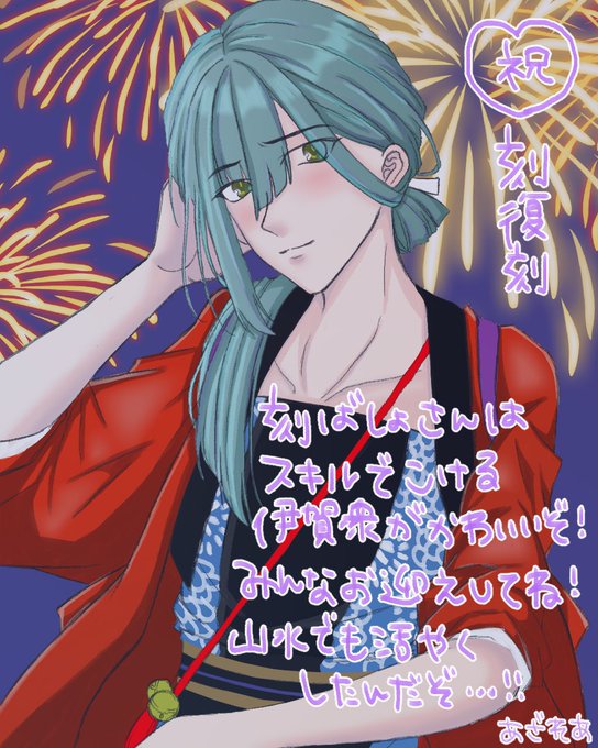 #剣が刻_ファンアート 久しぶりにタグつけちゃお! 芭蕉さん刻復刻おめでとう🎊 初期実装時、急に刻芭蕉さんアイコンに変わった時は早朝からパニクったことを思い出しますね…とてもいい髪型と鎖骨だと思います…。 まだお迎えしていない人はこの機会にぜひお迎えしてほしい🙏 (眉毛線画消し忘れた)
