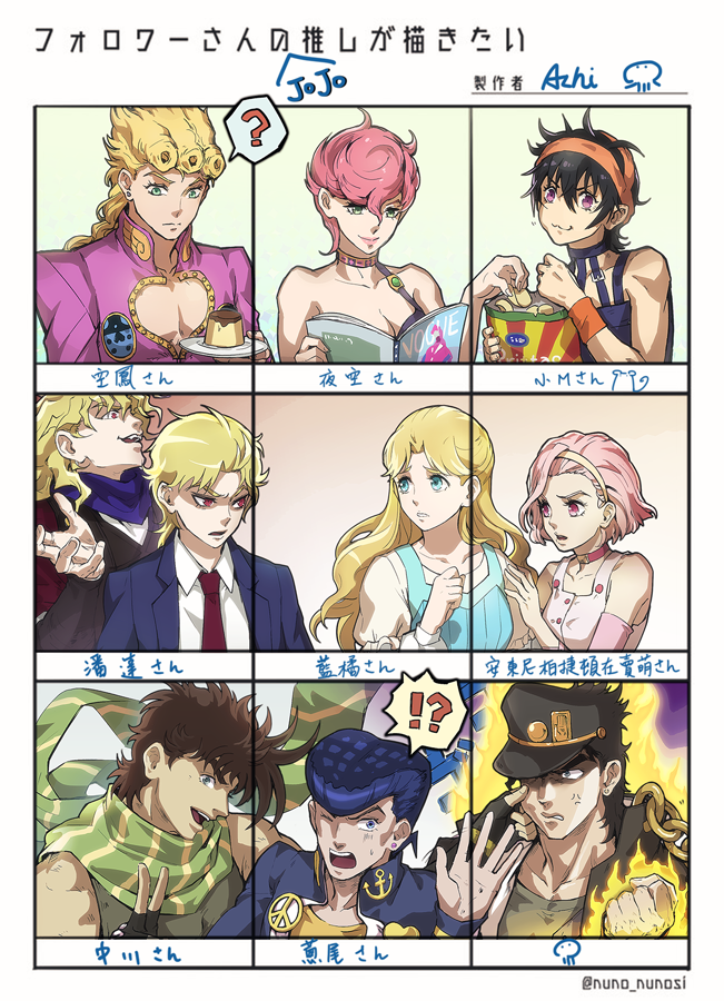 【JOJO】 テンプレを借りてPLURKの友だち&フォロワーさんのJOJO推しを描きました~✌️!!! 8人でしたので自分の大推し承太郎を追加しました~(*ˊᵕˋ*)੭ ੈ❤︎ 楽しかったよみんなありがとう(*´ロ`*)!!! #フォロワーさんの推しが描きたい #フォロワーさんのJOJO推しが描きたい