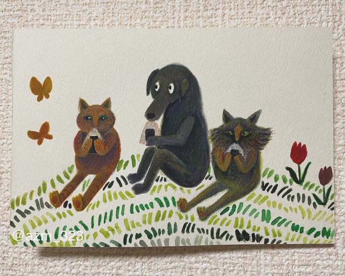 ▽ [ピクニック] [picnic] . . . 猫の兄弟に交じって みんなで仲良く、横並び○ なんと今日2022年2月22日は #猫の日 🐈 2がいっぱい🌱 ͛.* #illust #illustration #cat #dog #ねこ #猫 #いぬ #犬 #イラスト #水彩 #スーパー猫の日 #にゃんにゃんにゃん #にゃんにゃんにゃんの日 #azumakaori