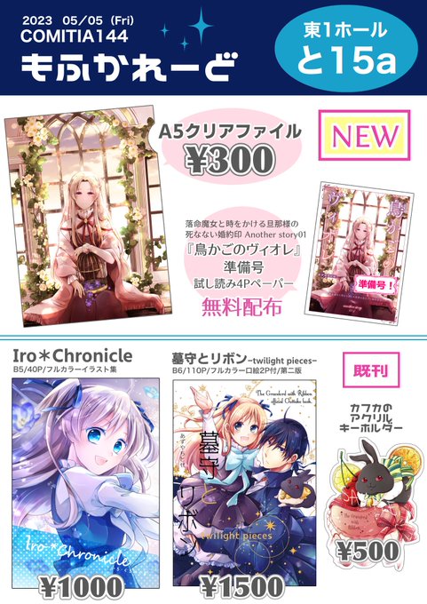【#COMITIA144お品書き】 5/5開催の #コミティア144 東1と15a「もふかれーど」にて参加させて頂きます。 PC不調のため落とした新刊の代わりにグッズを先行頒布と、準備号として「鳥籠のヴィオレ」の試し読み4Pペーパーを無料配布します。 お気軽に遊びにきてください☺️✨🐰🎀 続