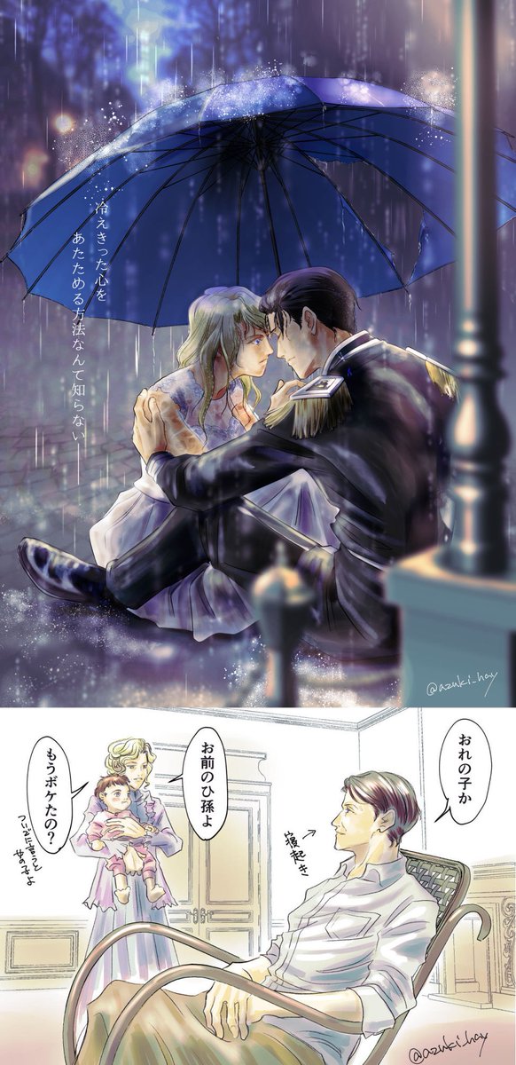#今月描いた絵を晒そう にょたロイ閣下(エルフィ視点) 戴冠式?フェリ&アレクとハルト&オスカー ミ越コラボ妄想(たぶん過去で一番いいねもらった😂) “傘”お題と銀河ご長寿伝説のロイエル 他に💜❤️挿絵とかキルアンなど、今月はいっぱい描いたーーー!