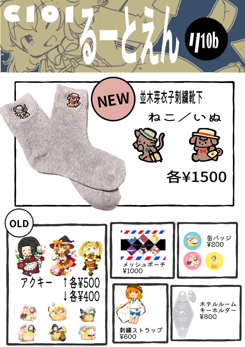 冬コミのお品書きです。新刊は天冥公演世界線の並木芽衣子さん本。新作グッズに並木芽衣子さん刺繍靴下(犬と猫の2種)があります! 当日はよろしくお願いいたします!