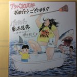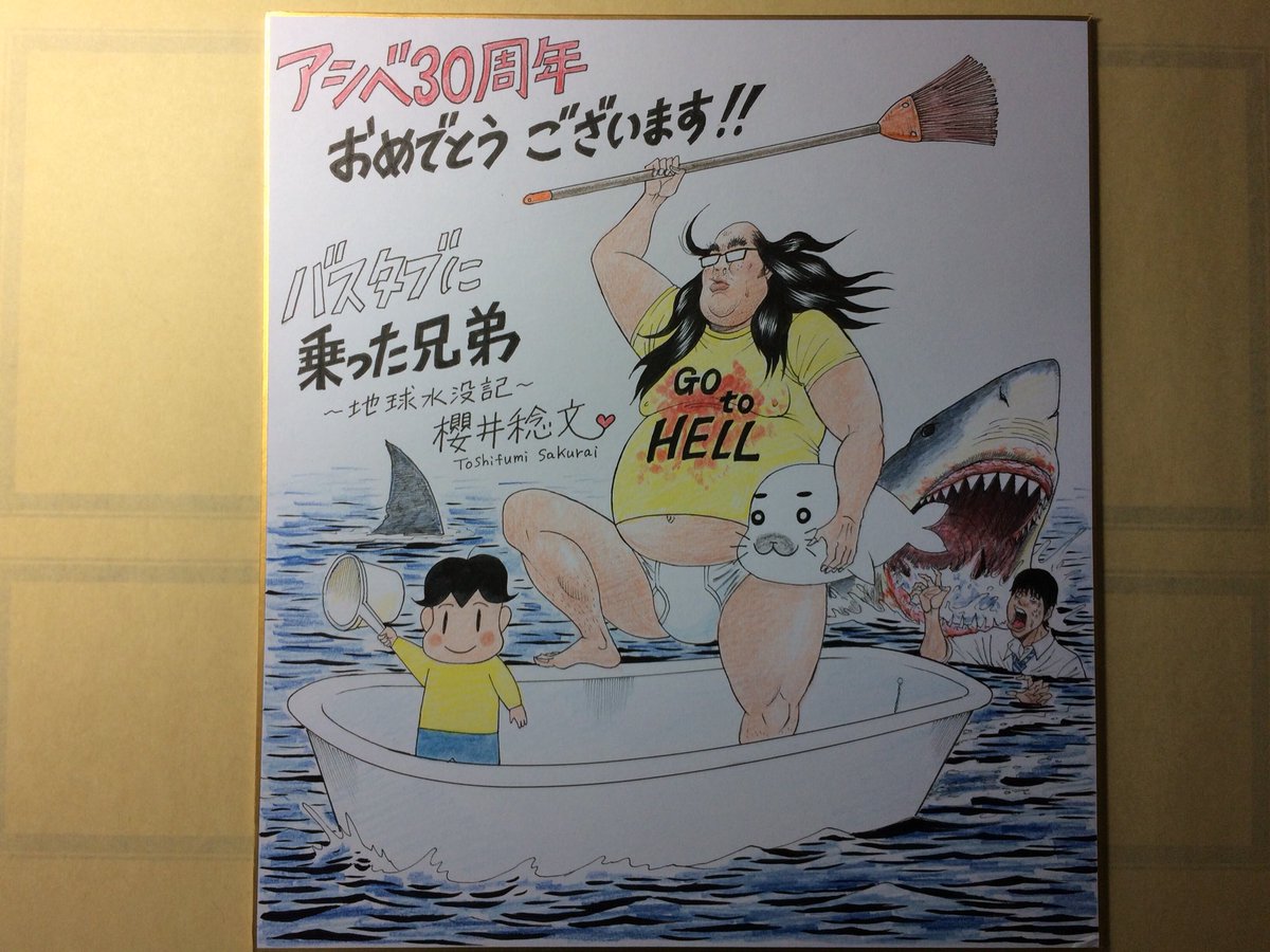 東急百貨店本店で開催中の少年アシベ連載30周年記念イベントでバスタブに乗った兄弟と合わせたコラボ記念色紙を描かせて頂きました。展示されてます