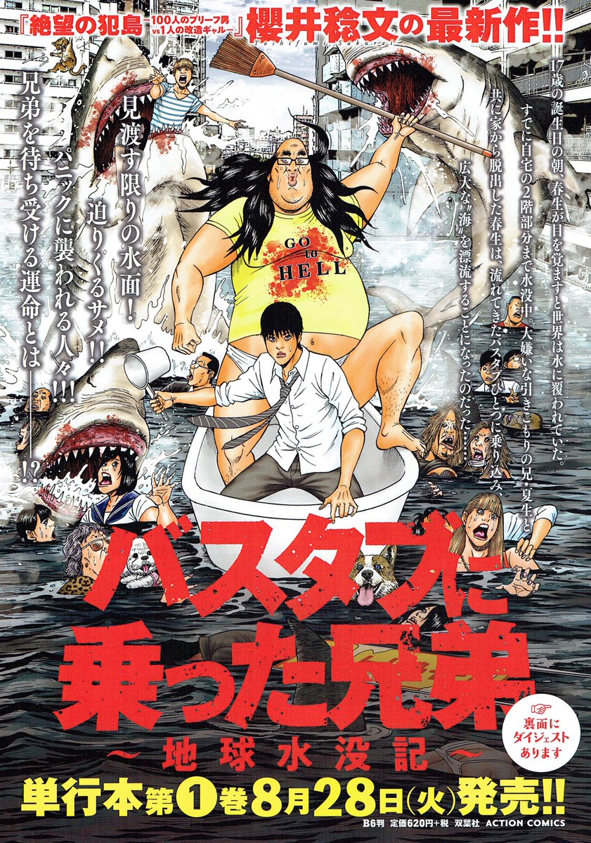 漫画アクション新連載「バスタブに乗った兄弟 地球水没記」スタートしました。 高校生の主人公春生(ハルオ)が29歳の引きこもりの大嫌いな兄夏生(ナツオ)とバスタブの船に乗って水没世界を漂流するサバイバル物語です。