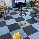 キッチンで洗い物して出たら犬が遊んで欲しくてギャグでオモチャを並べて笑って待ってた。犬って‥凄い