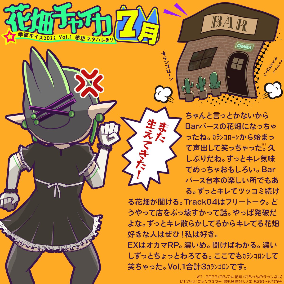 42 305 チャイちゃんの7月ボイスvol.1感想!ネタバレあり!花畑チャイカはバーのマスターではありません。 #お花畑青空大写生大会 #チャイカボイスダ 22/07/08 15:09
