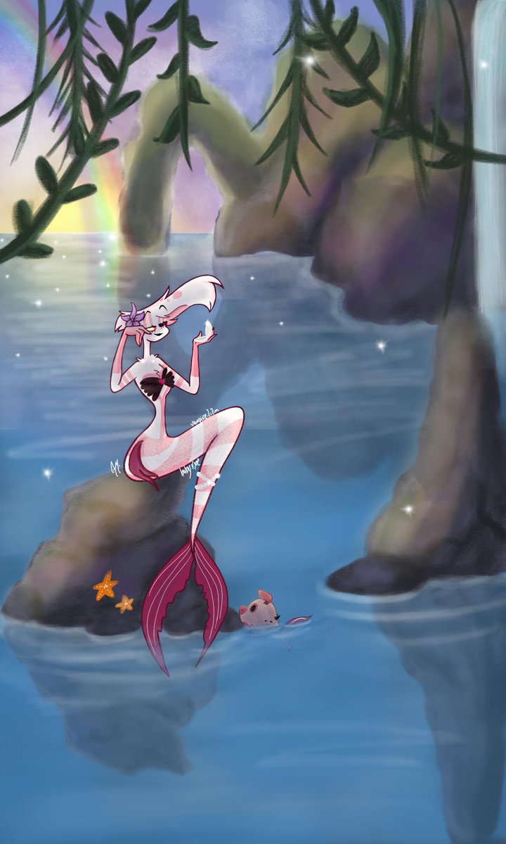 Congrats to a very good friend of mine for reaching 1.5K. Hopefully one day I get there, BUT until then, I present to you all Angel 🧜♀️🌊🐚🪸 Very heavily inspired by Mermaid Lagoon #AngelDust #HazbinHotel #HazbinHotelAngelDust #HazbinHotelFanart #mermay @disneydork1928