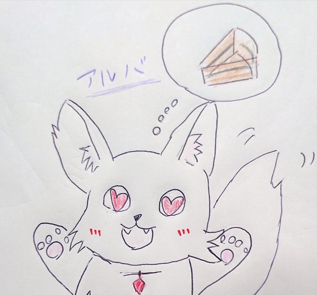 アルちゃんは耳と尻尾が特徴だからバランスが難しい🤔 もう少しうまく書きたい。 これが限界ですw テーマ 甘いものを考えるアルちゃん #アルバ絵