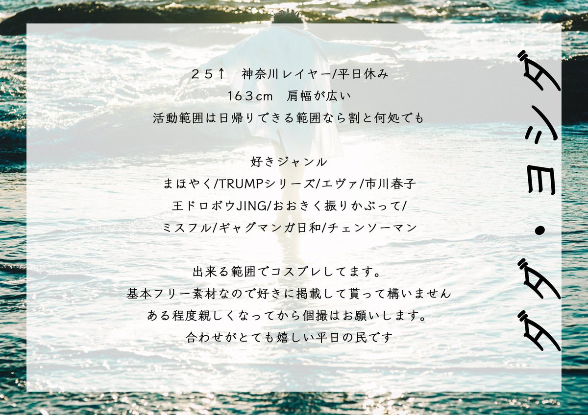 土日祝休みになったので✌️キャラクターの衣装着てお芝居するのが好きなレイヤーです。ゆるく、ながく、コスプレしてます。基本カメラマンさんにフリー素材で使われたいマン。 #いいねかRTで気になった人フォローする