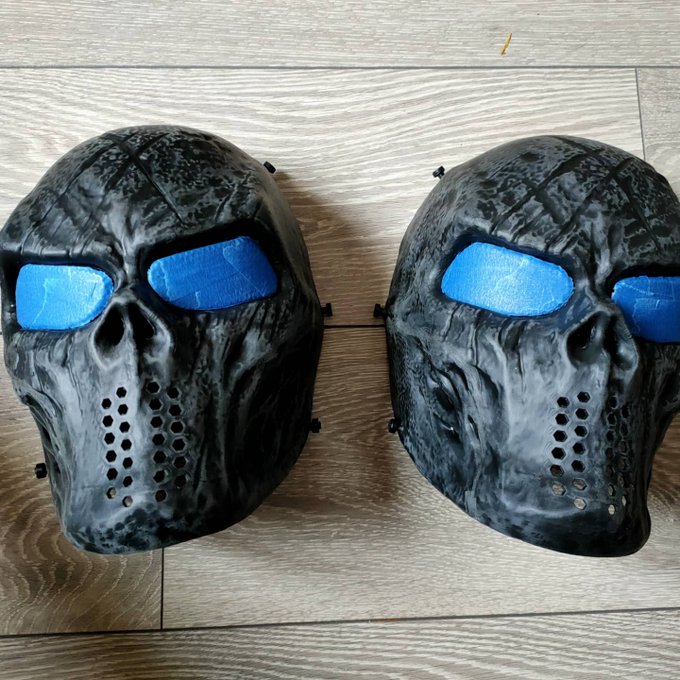 So I've not been well since New Year. So a little behind on the masks. Mask out the eyes and a coat of matt black acrylic spray paint. Just to give them an even start tone and allow better adhesion for the other paint. #DoctorWhoFlux #DoctorWho #cosplay #passenger