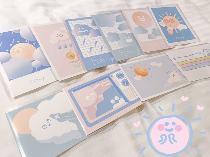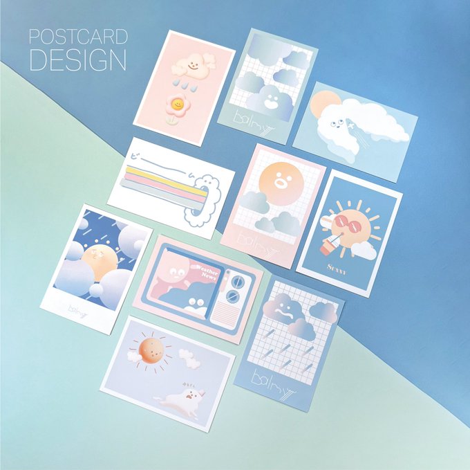 \商品紹介①/ #デザフェス56 で販売するポストカードのデザインを公開します! 天気をモチーフとしたキャラクターが描かれたポストカードを、 全10種類と豊富なラインアップで販売しますのでお楽しみに🤩🌈✨ #balmy #デザフェス #designfesta #イラスト #illustration #postcard #ポストカード