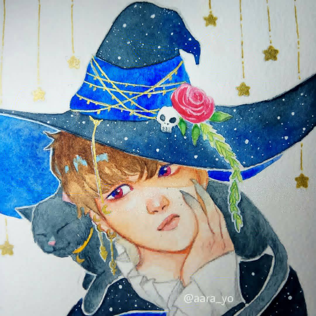 My attempt for #drawthisinyourstyle challenge by @nyangelus 💙 Adding smol furry friend for extra magical touch 🐱✨ I had fun while painting this. I hope you like it Nyangie 💙💙 #btsfanart #witchyoongi