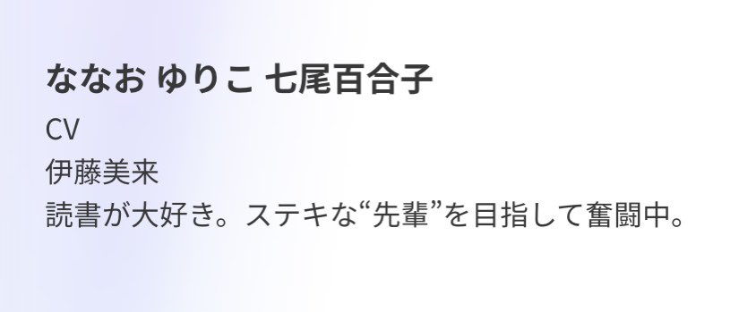 百合子だ〜〜〜〜〜〜〜〜〜〜〜〜! やっぱり[お気に入りの物語]とウィルゴの時のお洋服ですね…! そして“先輩”ということはやはりこれはムビマスの延長…? …lionlive-anime.idolmaster-official.jp/character/