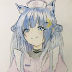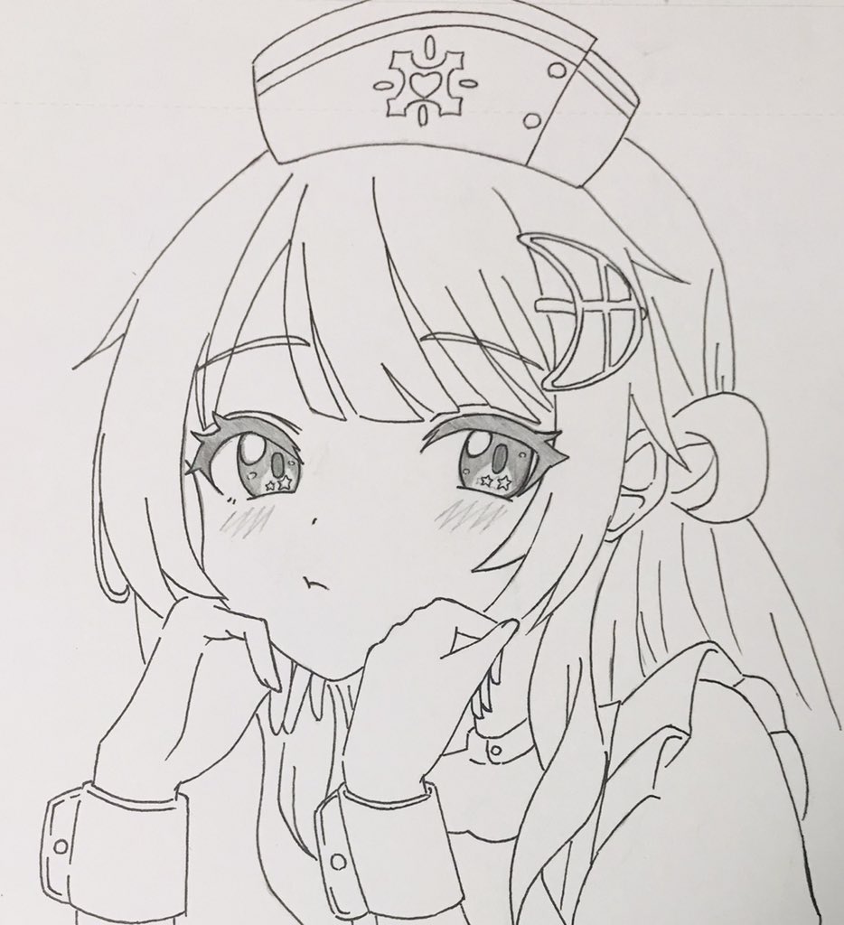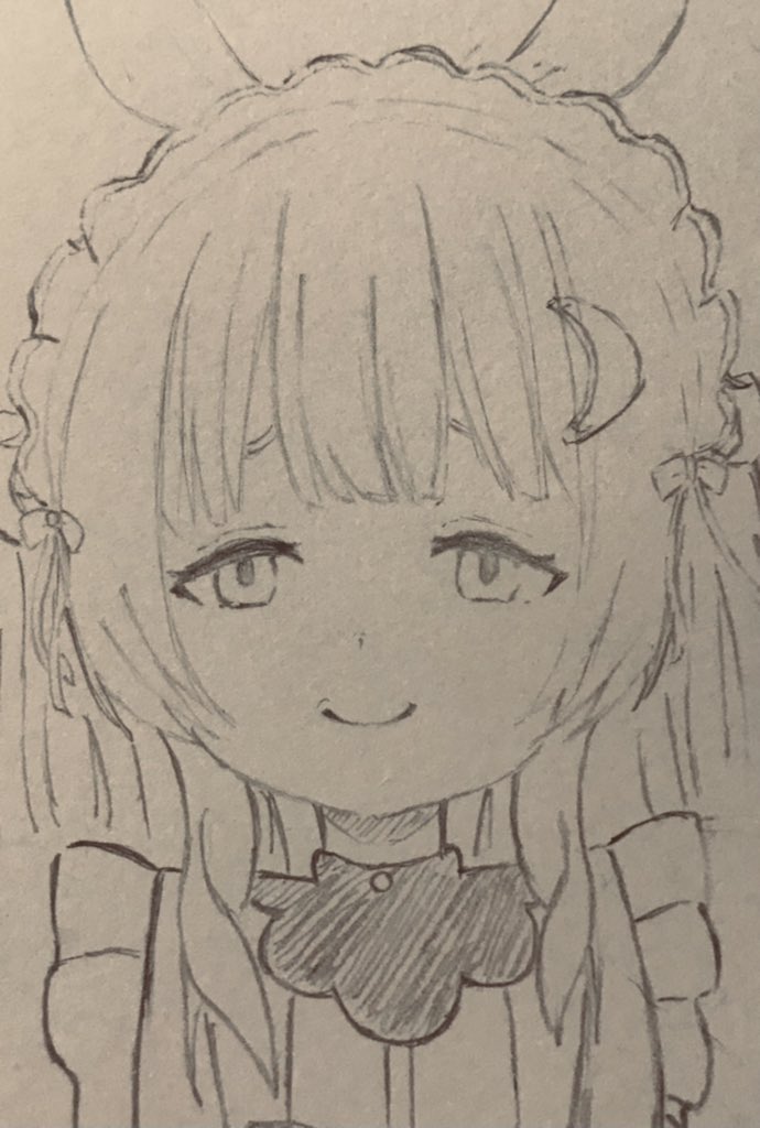 14 75 ドヤ顔にぃあ アナログ絵模写はドヤ顔のと立ち絵を少し模写しました。やっぱ女の子描くのむずい。色塗りしたいけど、失敗しそう…だなぁ。てか顔大きくなりすぎたな、もっかい描き直した方がいいかも… ホラゲー実況見てたから集中して書けんかったw #看谷にぃあ #にぃあーと 21/07/04 09:42