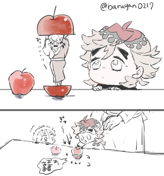 鬼滅リアタイ ちょこちょこ走る小さい半👺良かった こんなに小さいならリンゴから登場も出来るかな。 ちま🌈が押し潰して、こくしぼー🌙が慌てて止める