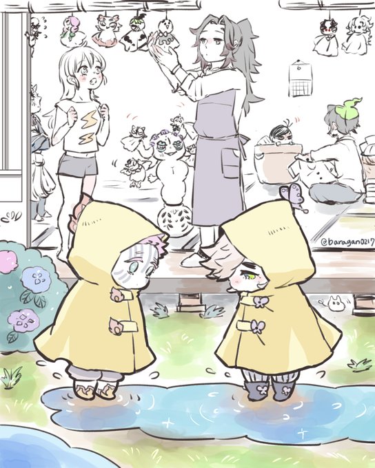 233 1502 こくしぼー家の梅雨入り☂️ 妓「無惨さまー湿気で髪がうねってますよ?」と言って洗濯ものを片付ける妓夫太郎 てるてる坊主を飾ったり、水たまりでアメンボを探したりする梅雨の上弦ズと無惨様🌂 23/06/07 23:08