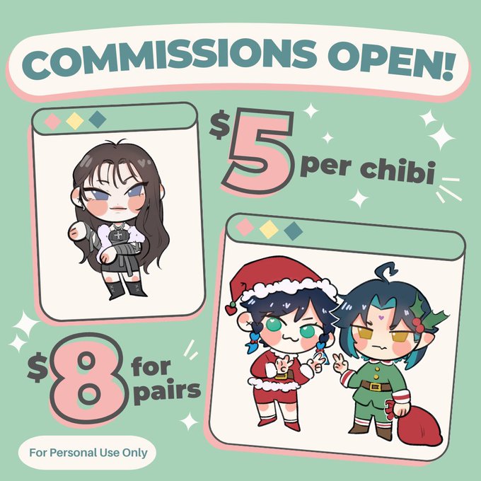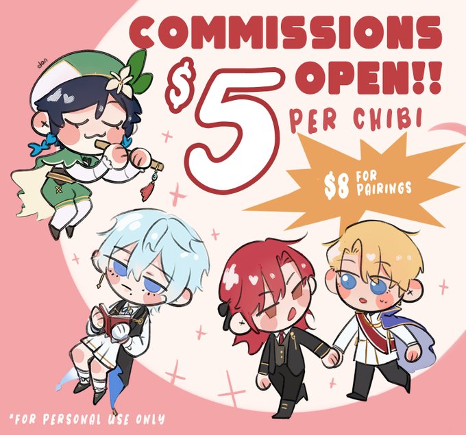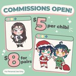 chibi commissions open !!! - full colored chibi in this style, white bg only - dm to secure slot <3 - (price in usd) paypal, ko-fi, gcash 💯 i kith you if u rt💏