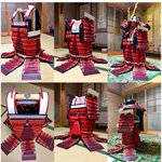 #このタグを見た人はラフ造型とその完成品を見せる 前にも上げたけどシリーズその2 時間と予算の都合で小札からじゃないけど、PP板から胴丸鎧を錬成した時の流れを順番に 板切って→いっぱい穴開けて→ひたすら平紐威して→こうなります