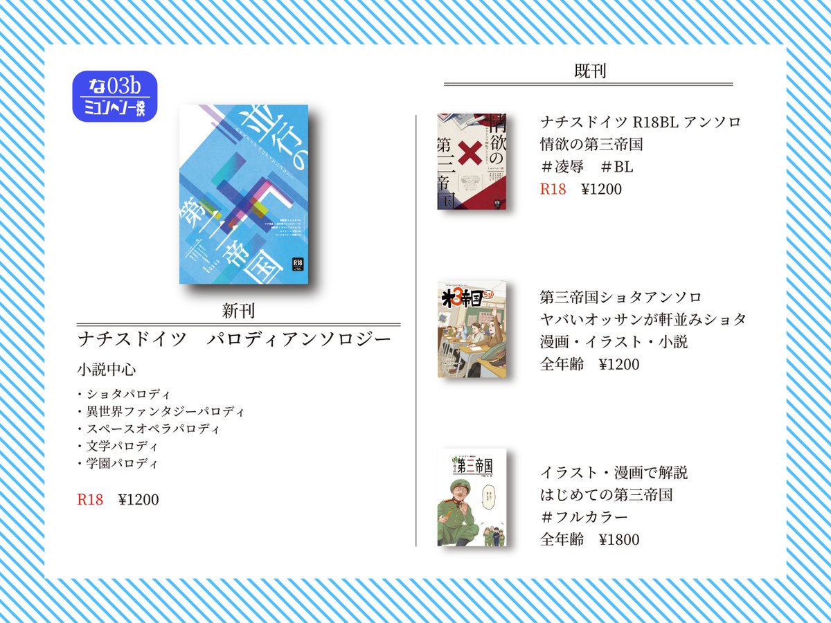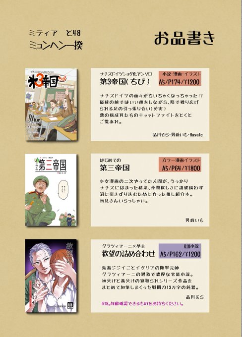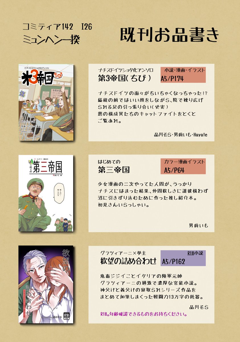 9/4(日)#COMITIA141 #コミティア141 ミュンヘン一揆 お品書きです。 スペース【と48】 ナチスドイツ中心の歴史創作。 小説・漫画・イラスト等出します。 宜しくお願いお願いします! (詳細サンプルはツリーにて)