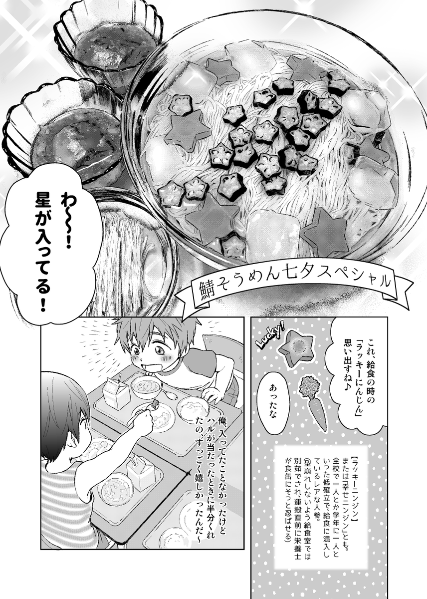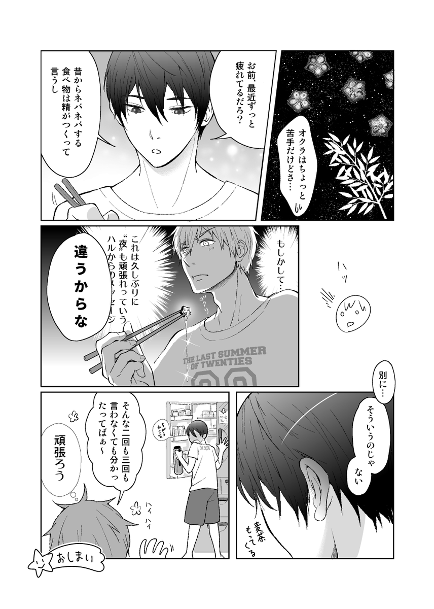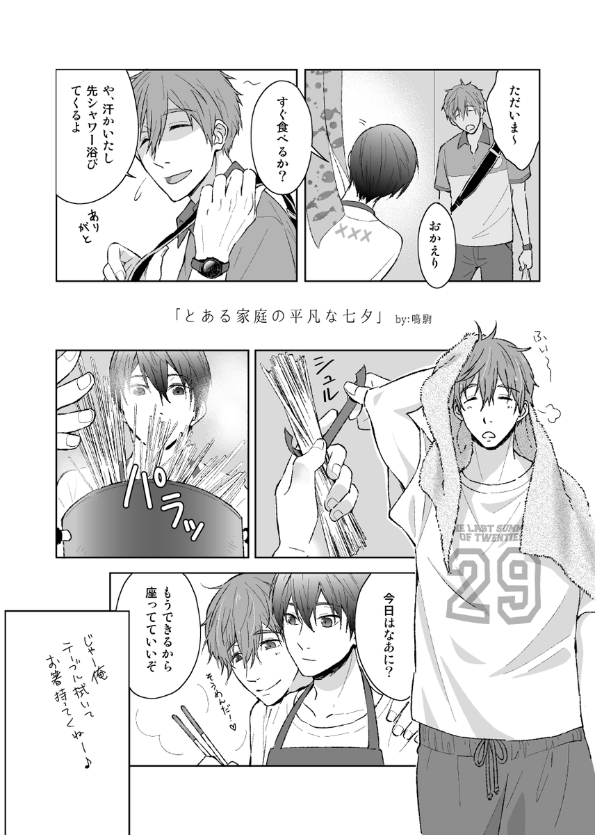 🎋七夕なので、2018年の幼馴染アンソロで描かせていただいたまこはる再再放送。 同棲しててハルちゃんが30歳になったばっかの年の七夕設定だったりします。鯖そうめんやオクラの★は実際に作って写真からトーン素材にしたのも良き思いでです😌 思い出のオンリー⇒ twitter.com/letsgo_037723