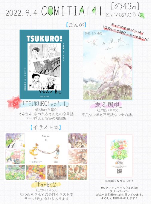 9/4(日) #COMITIA141 ▶︎ お品書き サークル名:といれがおうち。 スペース:の43a 新刊■合同誌『TSUKURO!vol.1』は会場限定頒布です。 別名義だんぺえ@danpee88のものも同スペースで頒布いたします。よろしくお願いいたします!#コミティア141 twitter.com/bb159_87/statu…
