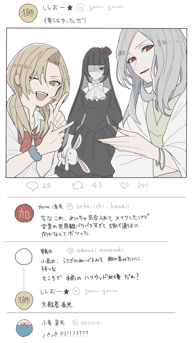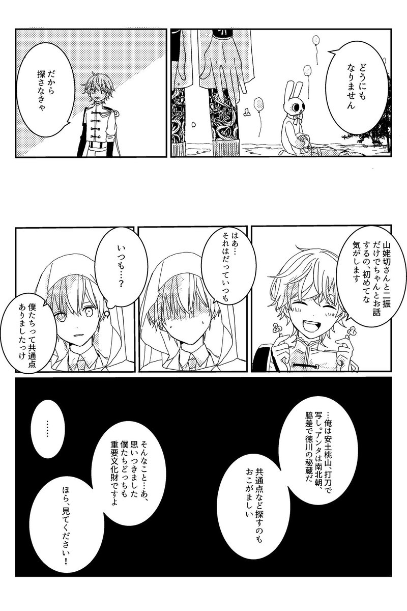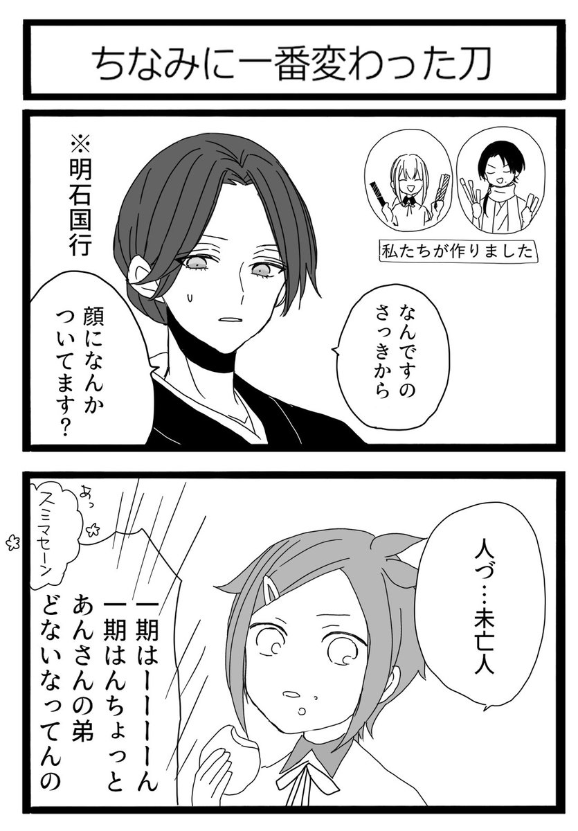 1390 8361 一人だけ姿が変わらな過ぎて近所から「妖怪」「魔女」「俺にだけ見える幽霊」とか言われてるタイプの鶴丸と一文字則宗 23/08/20 21:42