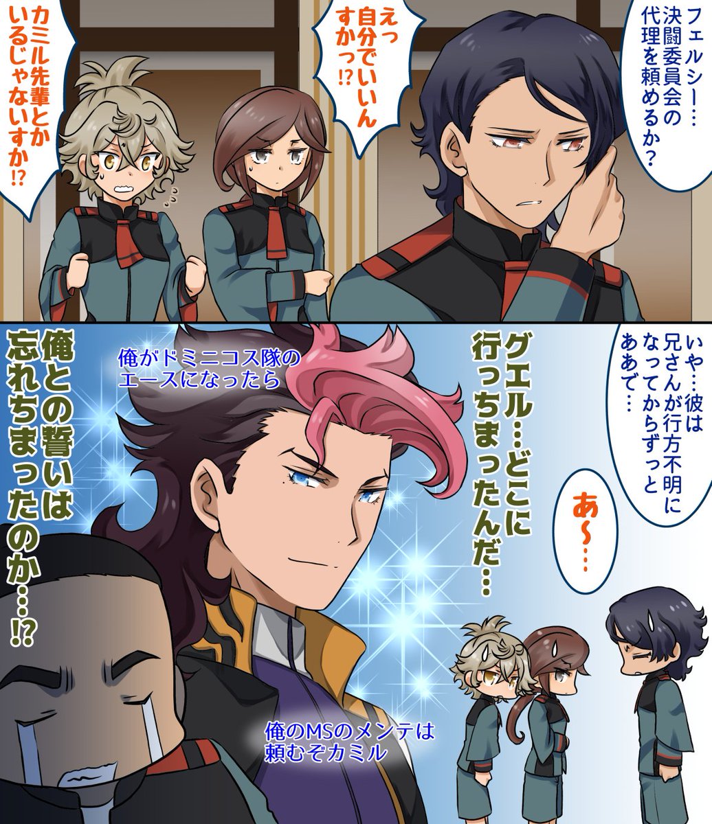 水星の魔女7話ネタ。グエキャンにフェルシーとペトラ参加してくれんかのう…。さすがに難しいか…(笑)。グエルくんがジェターク寮メンバーに腫れ物に触れるみたいな扱いになってないことを祈る…☆ #水星の魔女 #G_Witch
