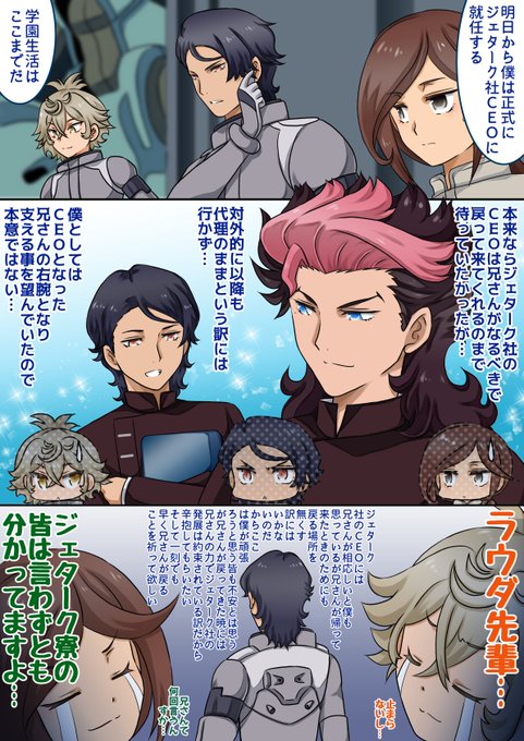 水星の魔女14話まんが。ペアルック…(笑)。テロ隠してたんでパパの事も隠してるのかと思いきや、ラウダの発言からすると少なくともジェターク寮の生徒は知ってる感じ?しかしラウダの立派な態度…パパがグエルくんと差をつけずしっかり教育受けさせてたのが感じられて泣ける😭 #水星の魔女 #G_Witch