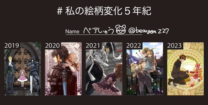#私の絵柄変化5年紀 こう見るとそんなに変わってないんだ😇そして地味かな…今後の課題はもっと色的にも見栄えを考えたい 因みに2019の懐かしい絵はスマホ指描き最後の絵で気合いを入れて描いた思い出😖(iPad買っても馴染めなくてしばらくスマホだった)小さい画面でムリしたな💧目も悪くなるはずだよ