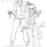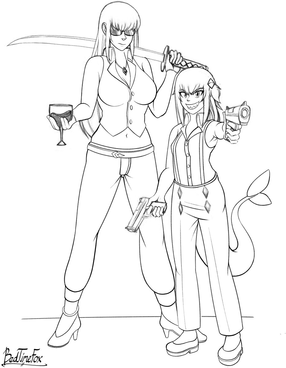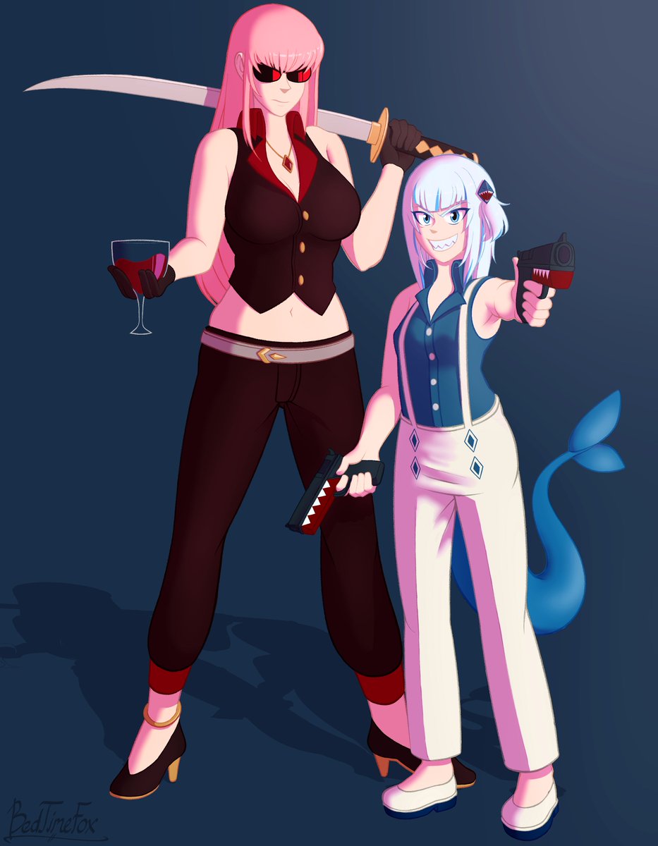 I loved Gura and Calli's song [Q] so much that I just had to draw a variation of their designs from that awesome music video! What does everyone think? Should I clean this up, color and shade it? Let me know ^U^ #gawrt #callillust #ENVtuber