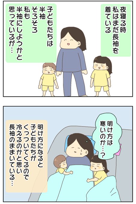 1 13 明け方になると子どもたちはくっついてくるから半袖は寒いのかな〜とか思ってる #絵日記 #育児漫画 23/06/16 19:22